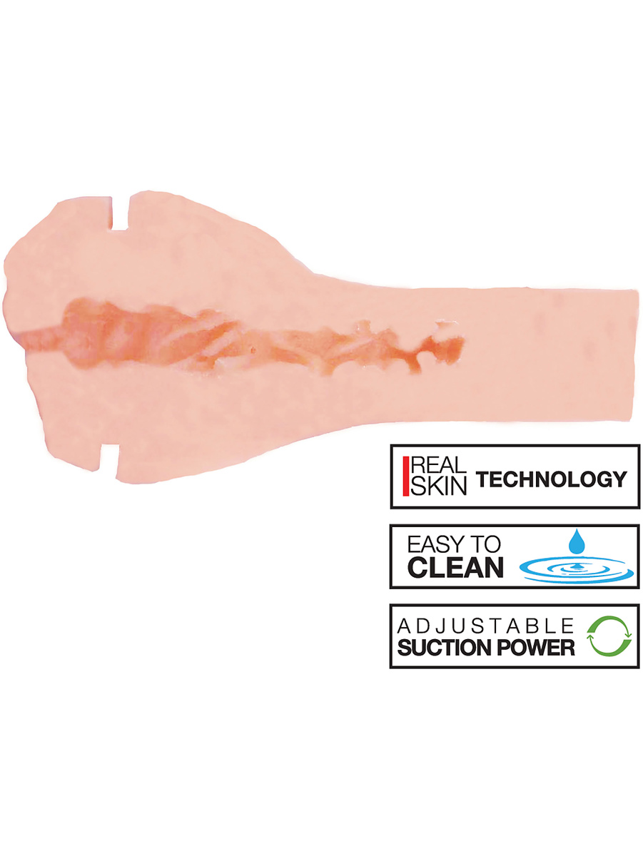 The soft sleeve in qualitative and durable TPR has an opening that is shaped like a realistic vagina and gives a lifelike sensation. On the inside there is a varied texture with stimulating grooves in different directions. The shell gives you a comfortable grip and at the bottom there is a small hole that allows you to adjust the sucking feeling yourself by placing your finger over the hole.