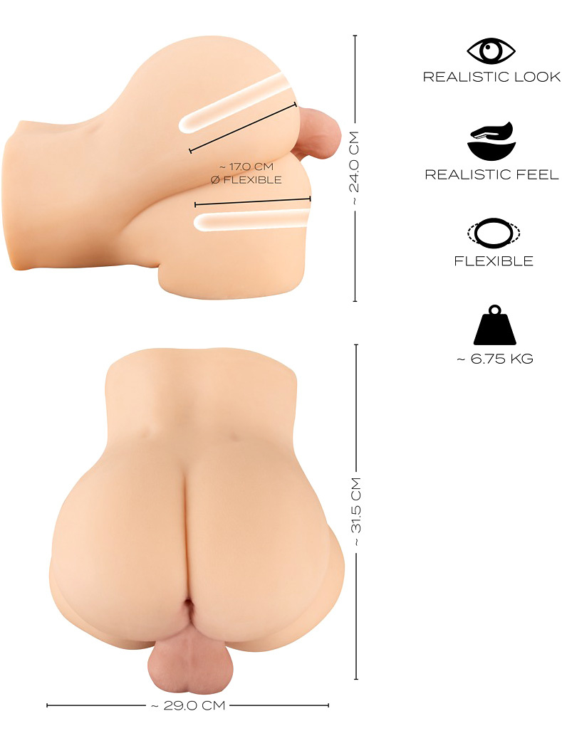 The two flexible pleasure tunnels – one vaginal and one anal – are designed with stimulating knobs and ridges that intensify the sensation with every movement. Weighing over 6 kilos, the torso rests firmly on any smooth surface, giving you the freedom to switch positions without losing control.