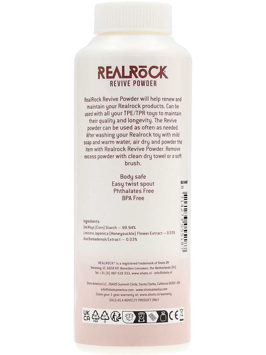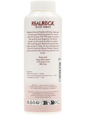 RealRock Revive Powder keeps your RealRock-products fresh and extends their lifespan. Suitable for all TPE/TPR toys and can be used as needed. After cleaning, allow to dry and apply the powder evenly for best results. Remove excess powder with a clean, dry towel.