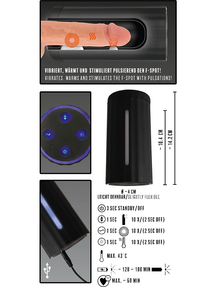 The two motors offer you a heating-function (max. 43°C), 10 different vibration-modes and the pulsating tapping-function with 10 different modes for the frenulum (penis-string).
