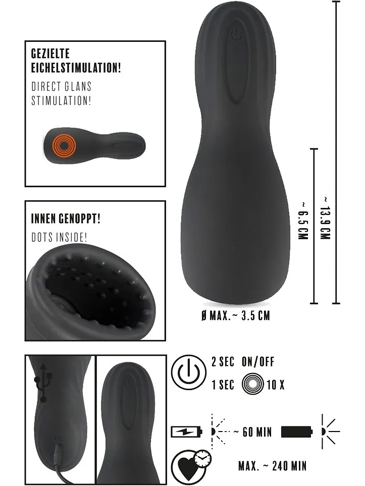 Glans Stimulator is a compact and very easy-to-use masturbator that stimulates the glans and frenulum (the string on the underside of the glans) with pleasant vibrations and soft knobs.