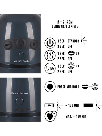 With the buttons you can easily choose between 4 vibration-modes and 3 suction-modes. There is also a button that securely stops the suction-process immediately. With a travel-lock, this masturbation-toy becomes a discreet travel-companion.