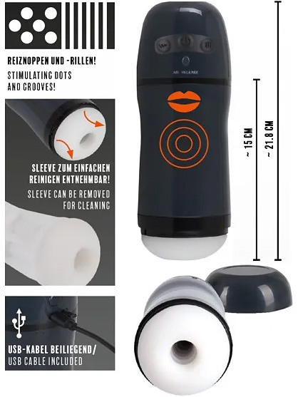 This is a penis vibrator that massages your entire penis with vibrations and sucking-effects. Inside the soft TPE-sleeve there are nice grooves, and at the inside also knobs, which give extra stimulation. Use water-based lubricant for the best possible feeling.