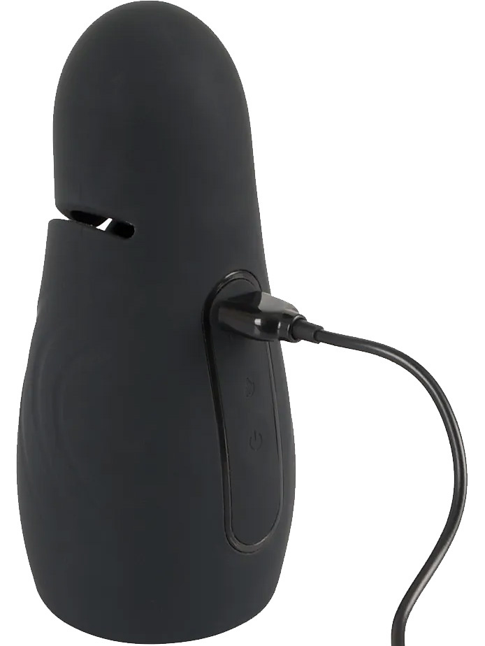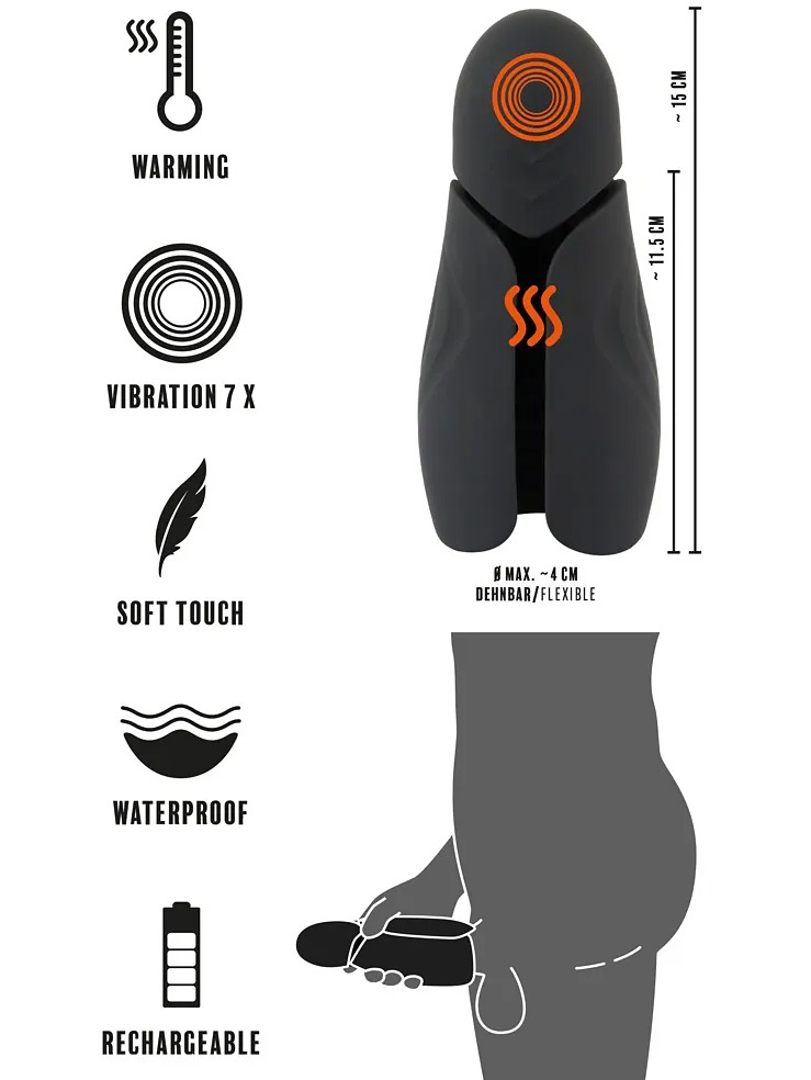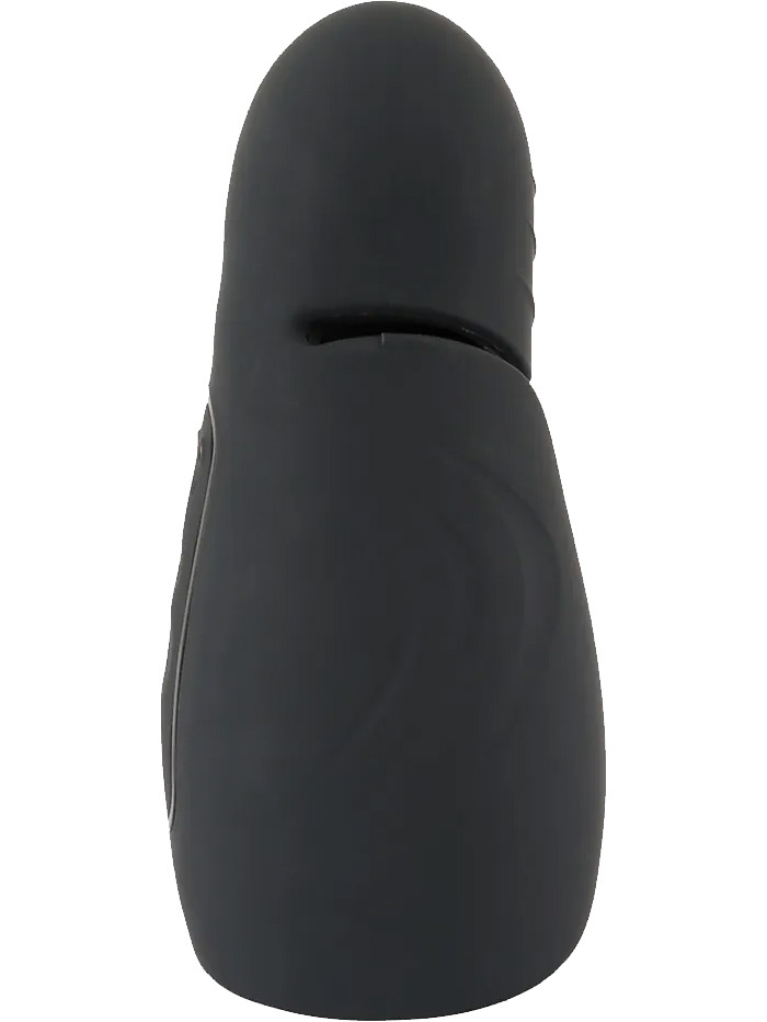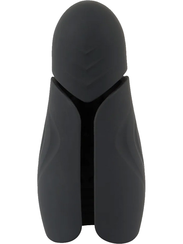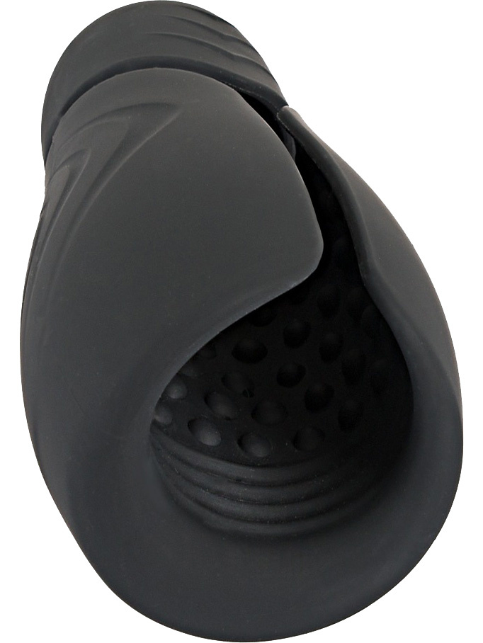 This is an easy-to-grip masturbator with stimulating knobs and grooves on the inside which, together with vibrations and heat, provide a pleasant penis-stimulation like a penis vibrator. The design allows you to squeeze it together for a tighter feel while the flexible top stimulates your glans.