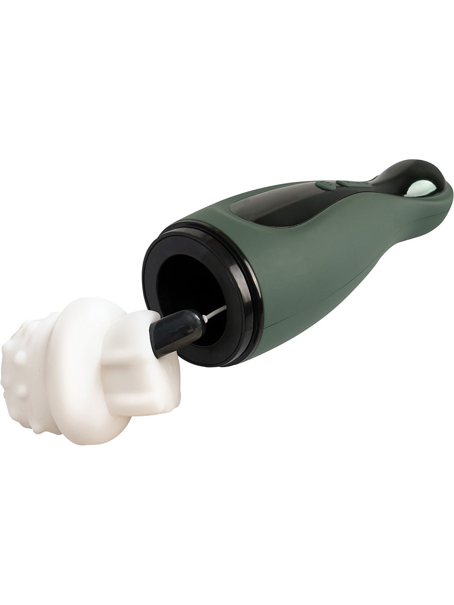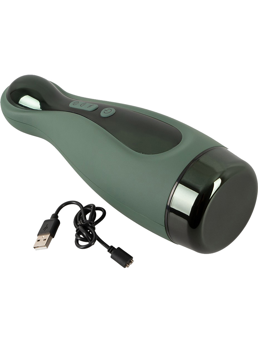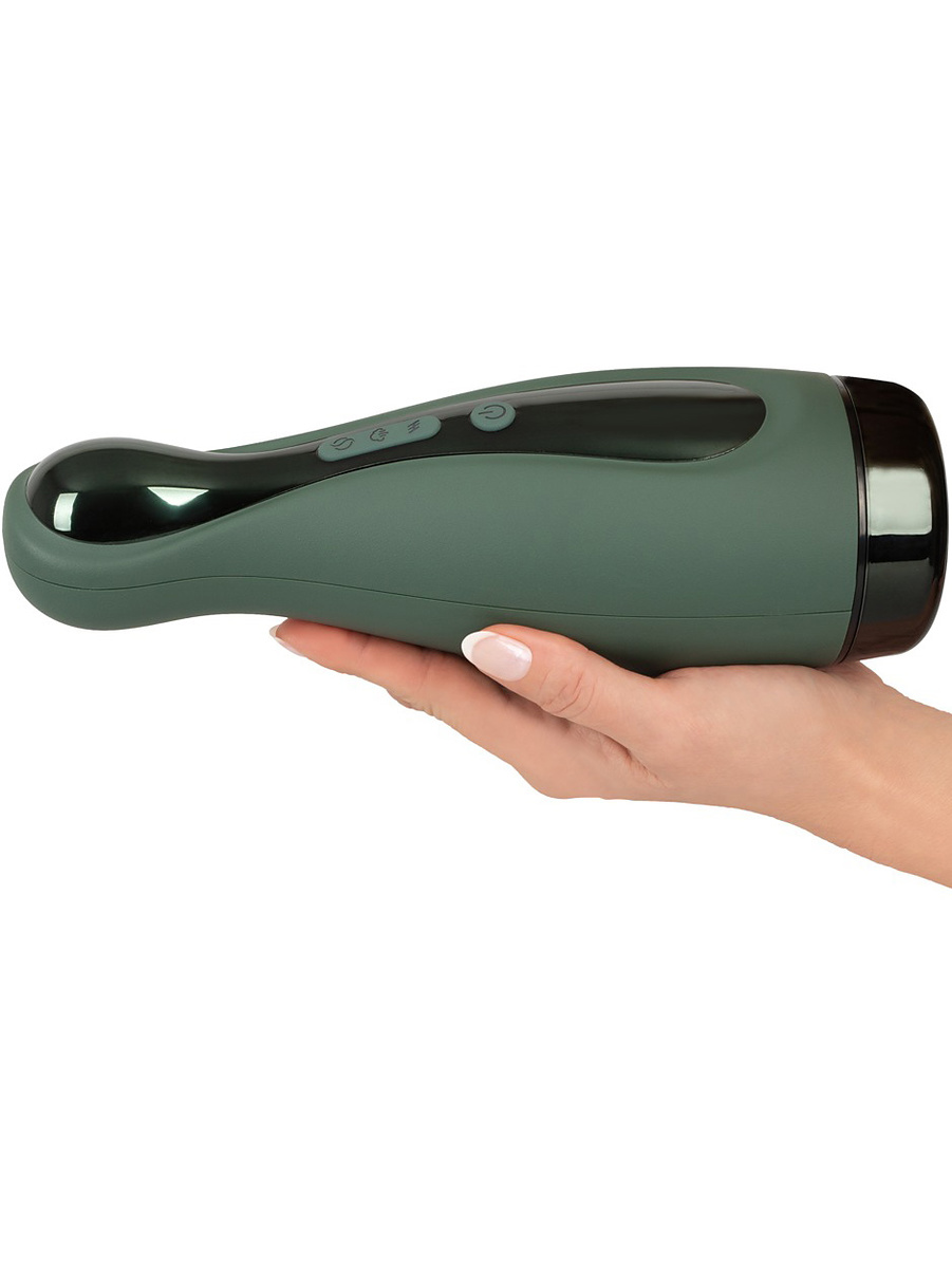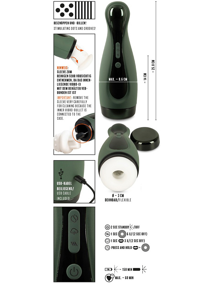 This is an easy-to-grip masturbator with two exciting functions that provide fantastic stimulation of your penis. This penis vibrator combines vibrations with pleasant suction functions. The soft TPE-sleeve has stimulating bumps and grooves that massage your entire penis. Use water-based lubricant for optimal sensation.