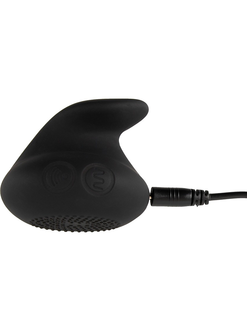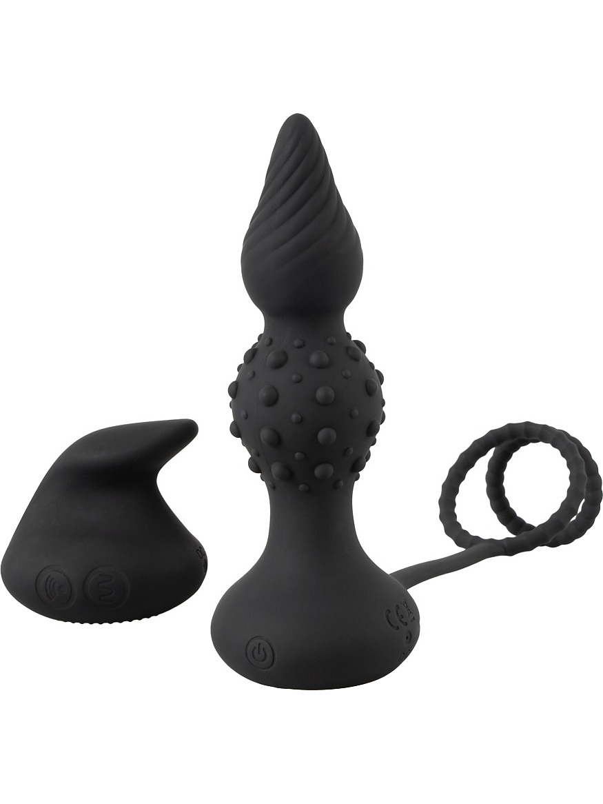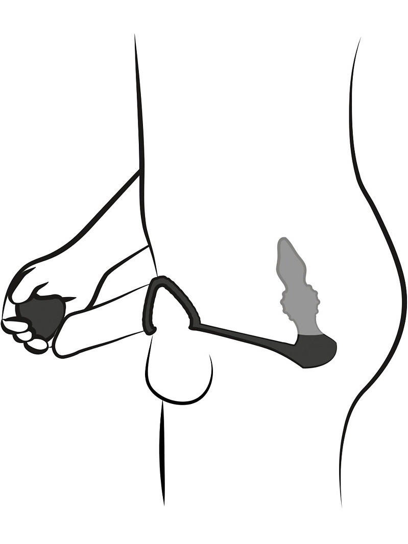 This is a combined penis/scrotum-ring with a firmly attached butt plug that delivers stimulating vibrations. The butt plug can be easily controlled with the wireless remote (which also vibrates) – thanks to its 10 meter range, you can also let your partner control the stimulation.