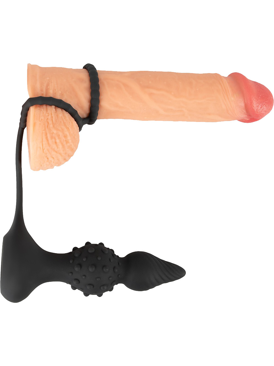 The rings surround both the penis and the scrotum firmly and can effectively support the erection for a strong and longlasting pleasure. The vibrating anal plug has a unique design with grooves at the top and knobs on the bulging part. Together with 10 different vibration-modes, the stimulation is nice and intense. The connecting strap rests against the perineum for additional stimulation.