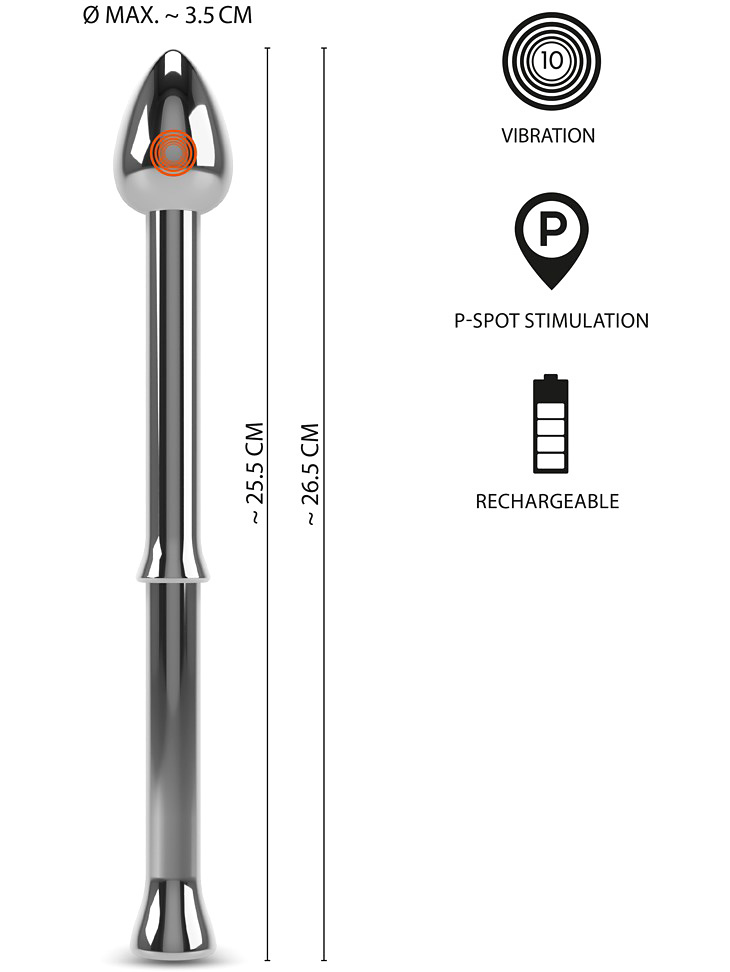 When the tip hits the right spot, the P-spot is stimulated with surgical precision. The integrated stop point in the middle acts as a safe-guide for how far the rod should be inserted anally. Once in place, you can choose from 10 different vibration-modes, easily controlled via the button on the wider base.