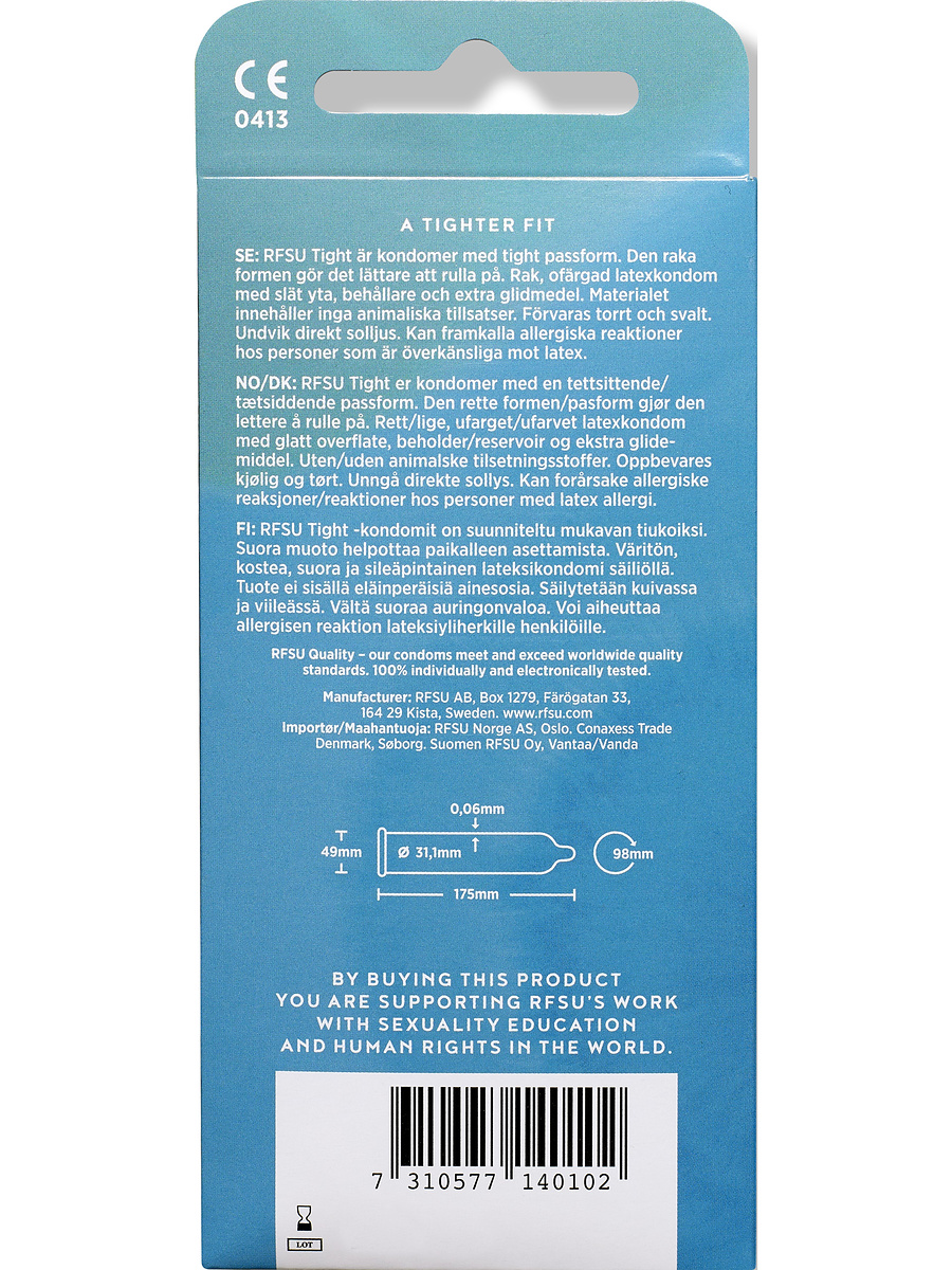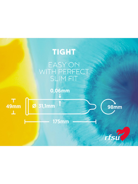 With RFSU Tight, you don't have to choose between safety and pleasure. It provides effective protection against both sexually transmitted diseases and unwanted pregnancy, while the tight fit increases sensitivity. All condoms from RFSU are electronically tested to ensure the highest quality and reliability.