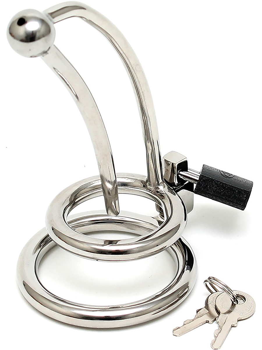 Above the penis plug is a part that attaches to a penis ring (inner diameter 3.5 cm). In addition, there is a larger ring (inner diameter 5.2 cm) which is placed both around the penis and scrotum and which is locked in the other part with the help of the included padlock (two keys included). That way, it sits securely in place and maybe it's your partner who takes care of the keys and takes over the power?