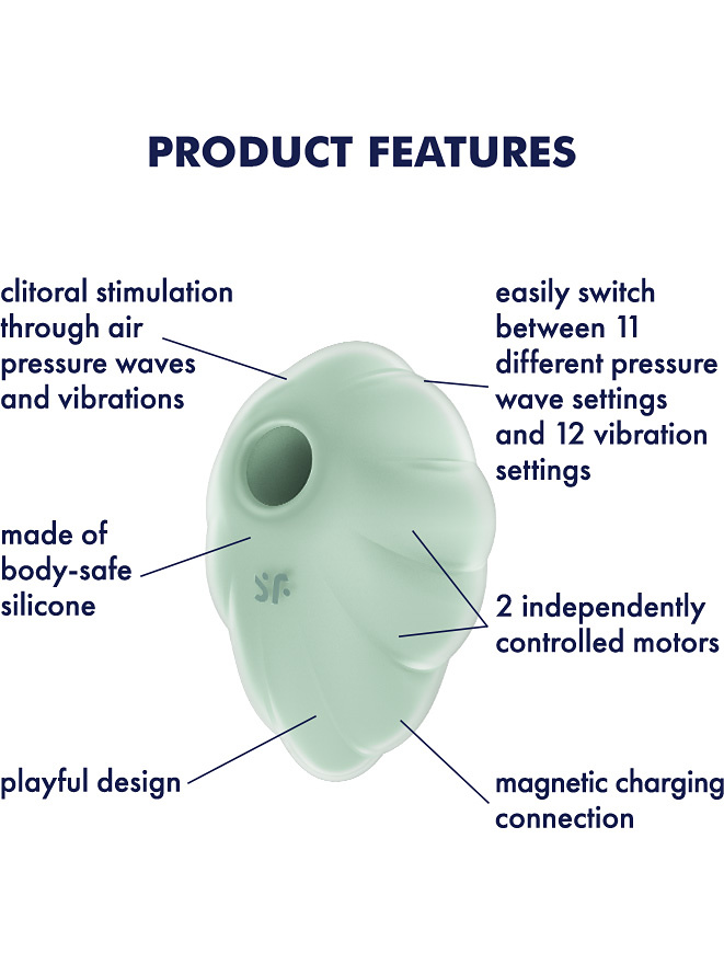 The small opening pleasantly embraces your clitoris to stimulate with pressure waves without direct contact. With a total of 11 intensity-levels, you can decide for yourself how intense the feeling should be. You can also combine the pulsating pressure waves with strong vibrations - choose between 12 exciting vibration-modes. The functions can be controlled separately via the buttons on the toy for a customized experience!