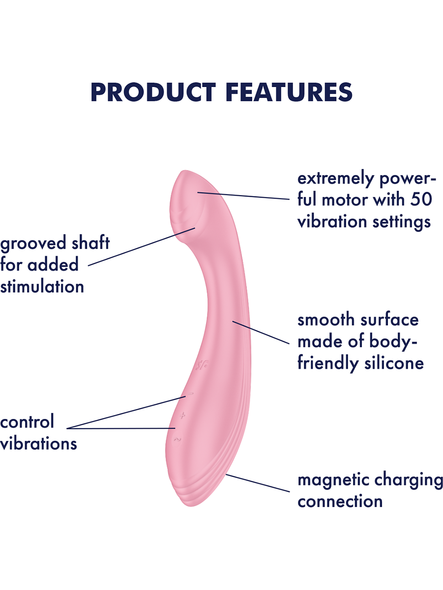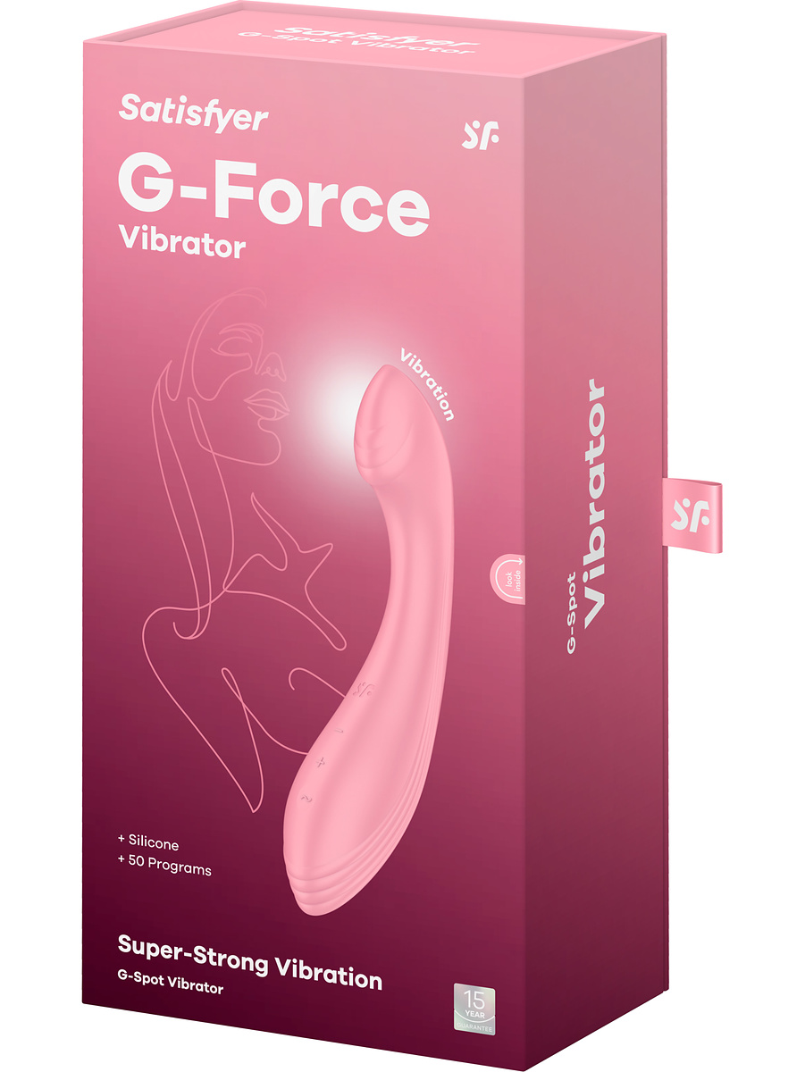 G-Force from Satisfyer is the ultimate vibrator for effective stimulation of the G-spot. It pampers your G-spot with strong vibrations, a flattened top and soft grooves. With 10 different vibration-patterns and 5 intensity-levels, you get a total of 50 pleasure-combinations to explore.