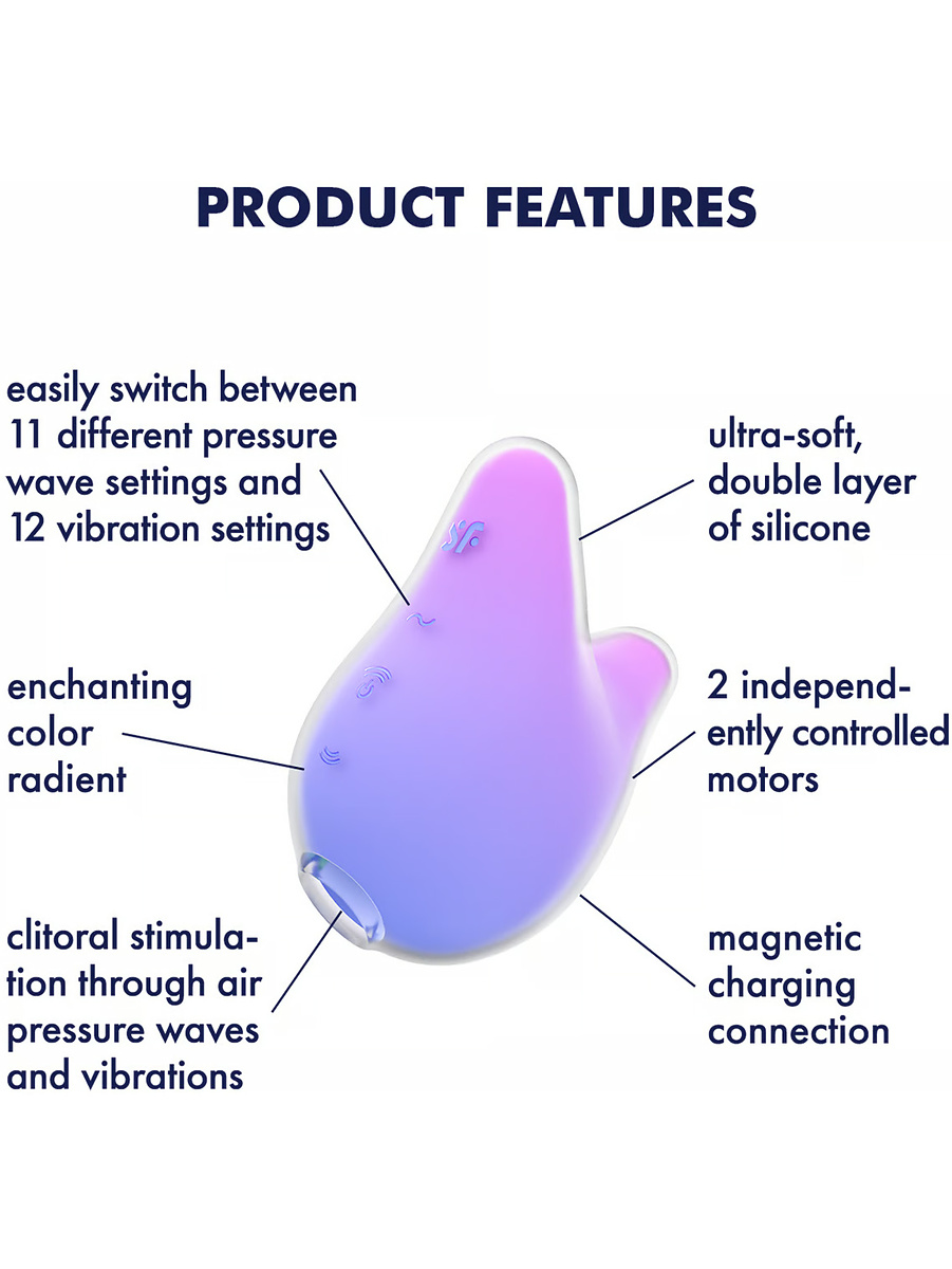 Mermaid Vibes from Satisfyer is a playful air pressure vibrator that gives you fantastic clitoral stimulation thanks to its strong vibrations and Air Pulse-technology. The delicious color-combination is surrounded by transparent silicone for an even softer touch.