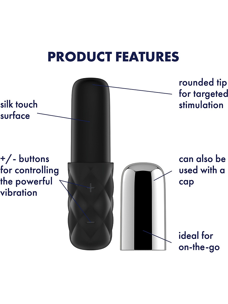 Remove the silver cap and let the silky shaft in skin-friendly silicone stimulate your clitoris or other sensitive points. You can also leave the lid on during stimulation if you want a harder surface. With the two buttons on the nicely designed handle, you control its very strong, deep and silent vibrations. Choose from as many as 15 exciting vibration-programs.