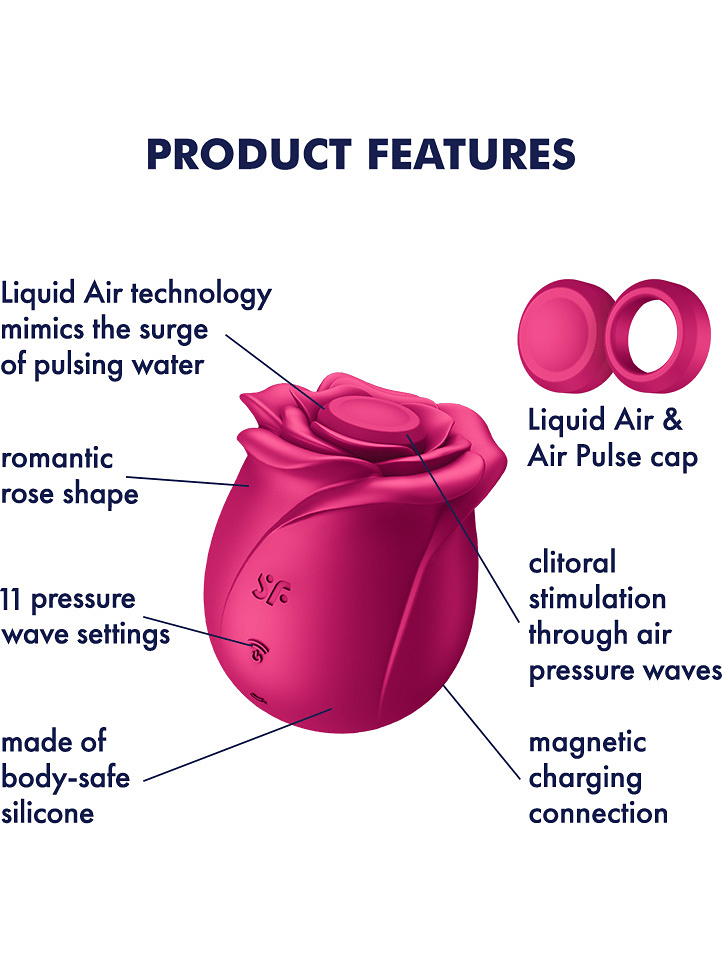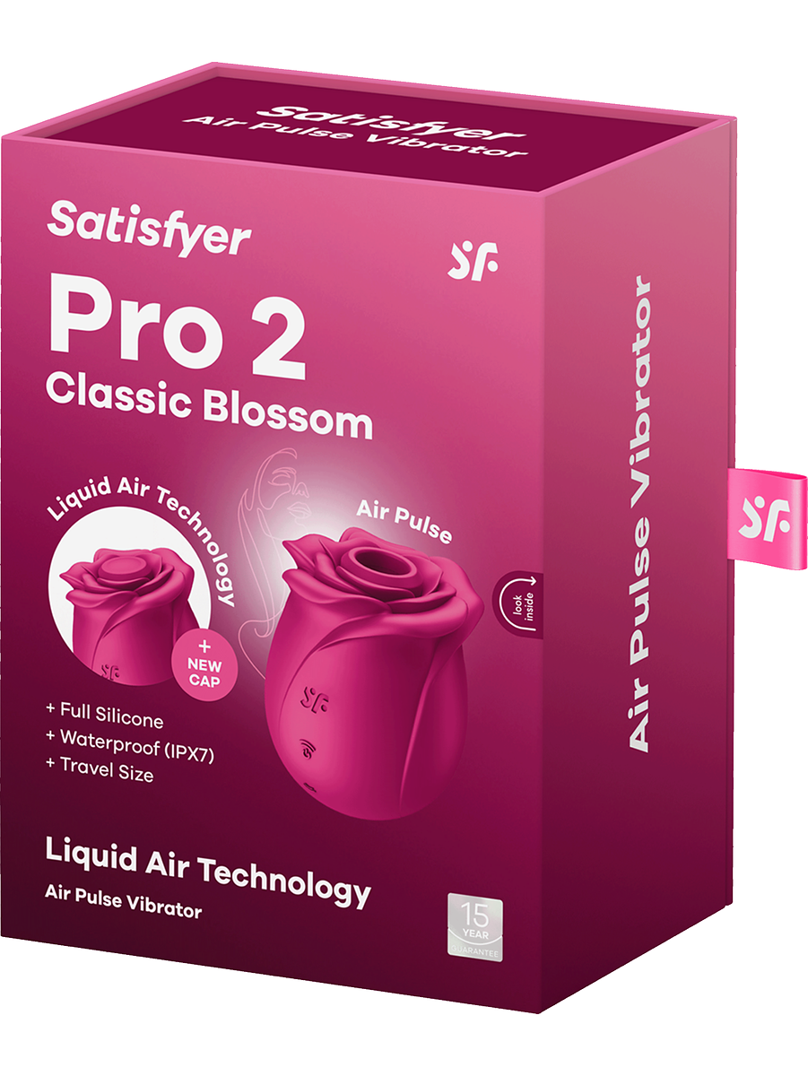 Satisfyer Pro 2, Classic Blossom combines a timeless rose-design with amazing technology like no other. Not only will it pamper your clitoris with pressure waves without direct contact, it also has a unique nozzle that gives a completely unique and even more intense sensation. The innovative Liquid Air-technology with the thin silicone membrane mimics the feeling of pulsating water.