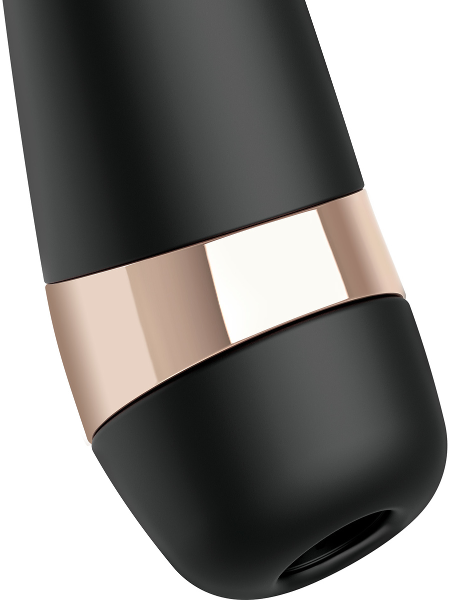 This model of clitoral vibrator, Satisfyer Pro 3, Vibration, has an elegant design that beautifully combines matte black with a rose-colored detail. The very top where the opening sits has a perfect angle to enclose your clitoris and stimulate with both pressure waves and vibrations.