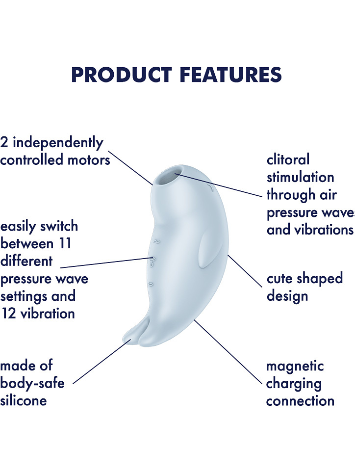 The small opening pleasantly embraces your clitoris to stimulate with pressure waves without direct contact. With a total of 11 intensity-levels, you can decide for yourself how intense the feeling should be. You can also combine the pulsating pressure waves with strong vibrations - choose between 12 exciting vibration-modes. The functions can be controlled separately via the buttons on the toy for a customized experience! Seal You Soon can also be used as a classic lay-on vibrator thanks to its vibrations in the tail-fin.