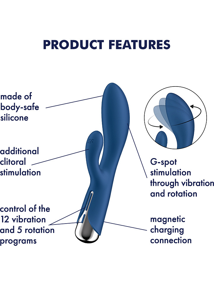 Satisfyer's innovative Spinning-series is guaranteed to release your desires and offer a whole new level of pleasure. The Spinning Rabbit 1 is designed to stimulate your G-spot with vibrations and rotation and the clitoris with vibrations for a perfect sensation.