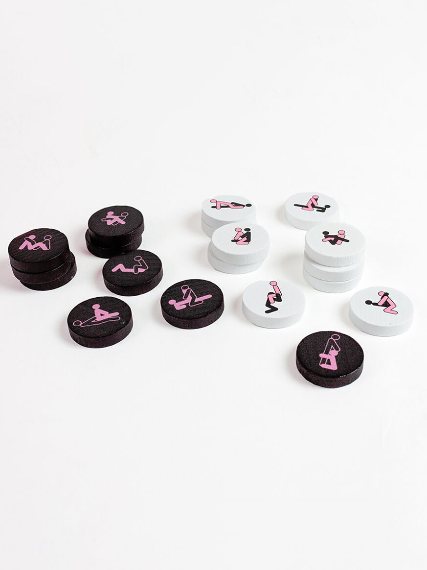 - 42 chips (21 pink + 21 black) with unique Kamasutra positions