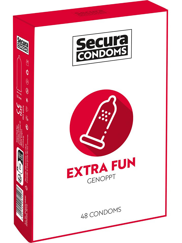 Extra Fun contains 48 pieces of transparent latex-condoms that are treated with high-quality silicone-based lubricant for optimal and longlasting sliding. The outside has a lovely bumpy surface that stimulates your partner extra. They are cylindrical and have a perfect fit. They also have a container on top.