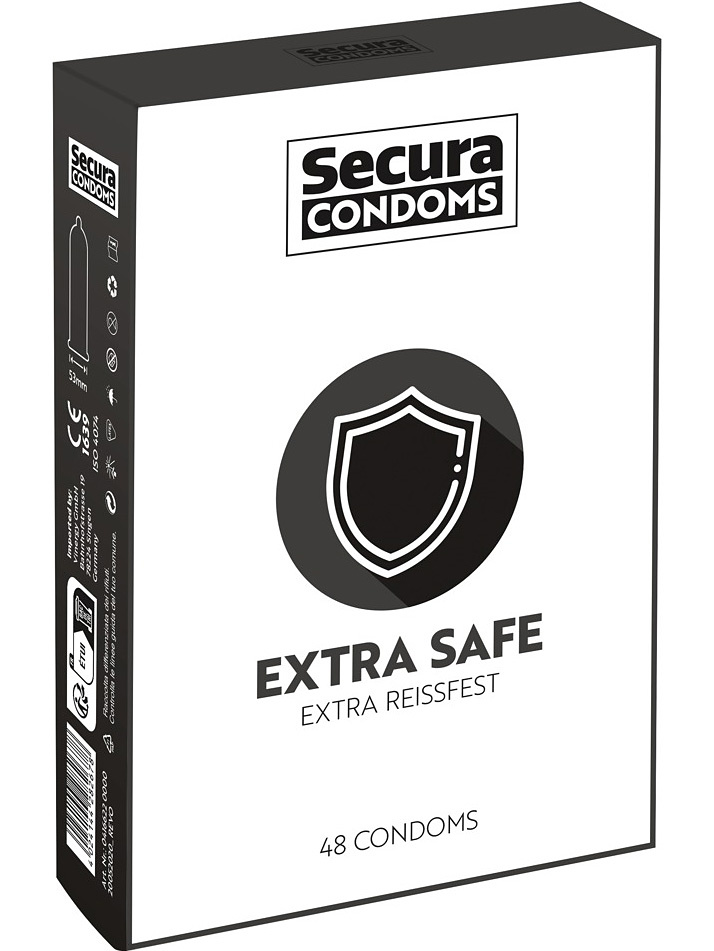 Extra Safe contains 48 extra thick and strong latex-condoms for safe sex. The increased thickness reduces the friction on the glans, which means that the stimulation will not be as intense, so you can improve endurance during intercourse. The condoms also provide extra safety during anal sex.
