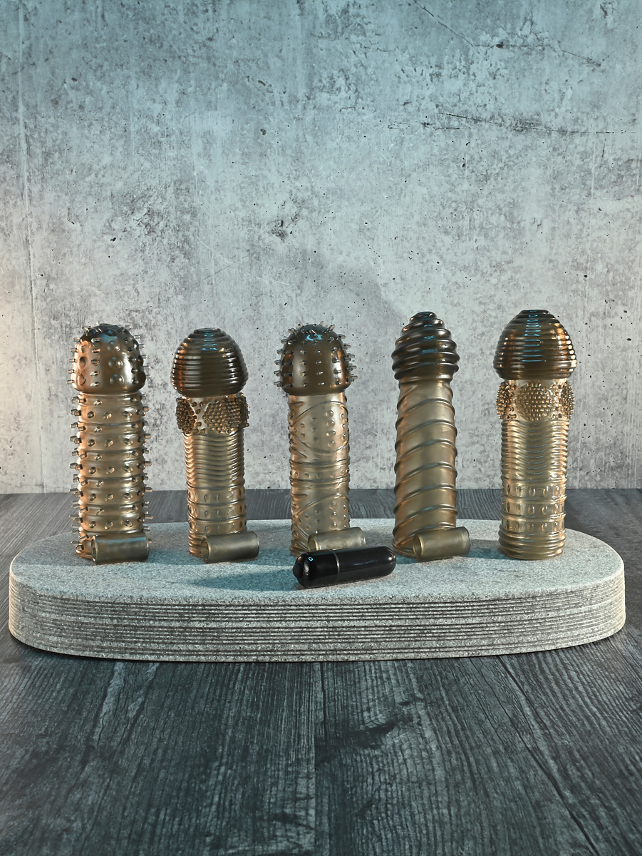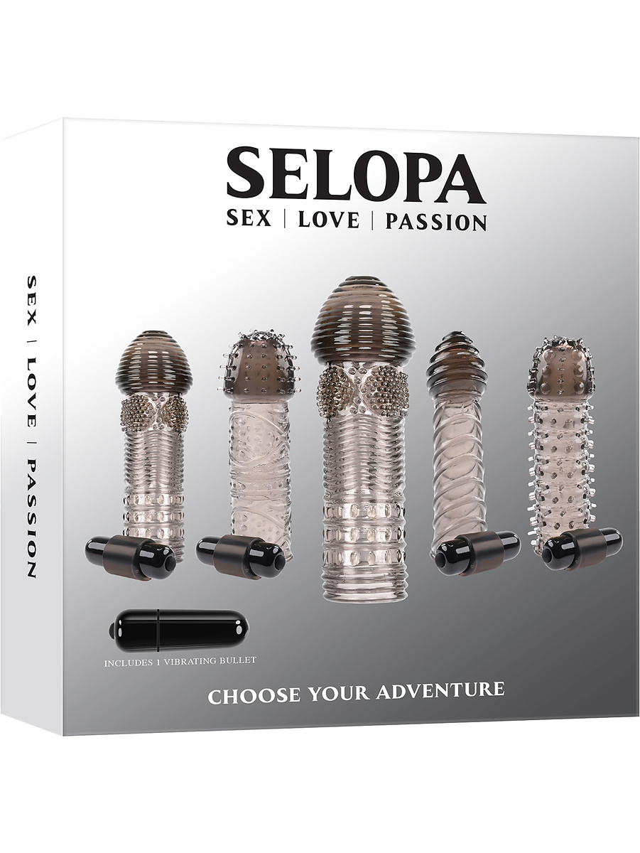 Choose Your Adventure is a set of five penis sleeves that add length, girth and stimulating textures to enhance your sexual experiences with your partner. Also included is a bullet vibrator that you can place in the loop found on four of the penis sleeves. Perfect for stimulating your partner's clitoris during penetrative sex.