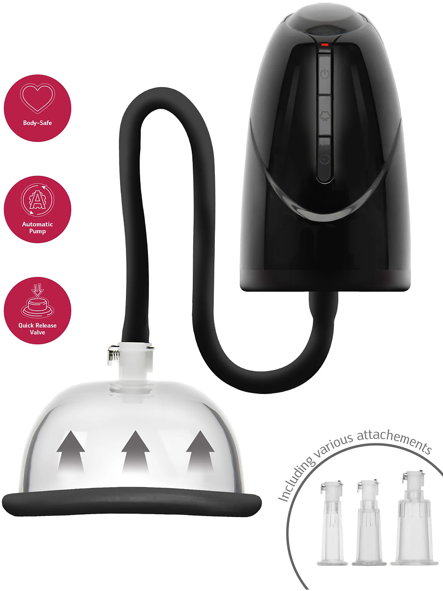 In addition to the larger vacuum cup for the vagina or breasts, three smaller cups in different sizes are included, perfect for targeted stimulation of the clitoris or nipples.