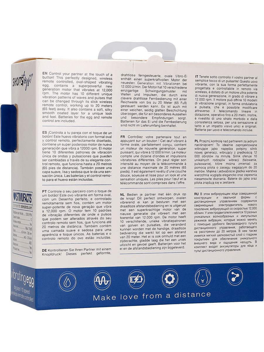 With this pleasant vibrating egg from Shots Toys, new limitless sexual experiences are within reach. The wireless remote creates a sense of freedom. In addition, the wireless controller has a small safety-hook so you can easily attach it to your key-ring.