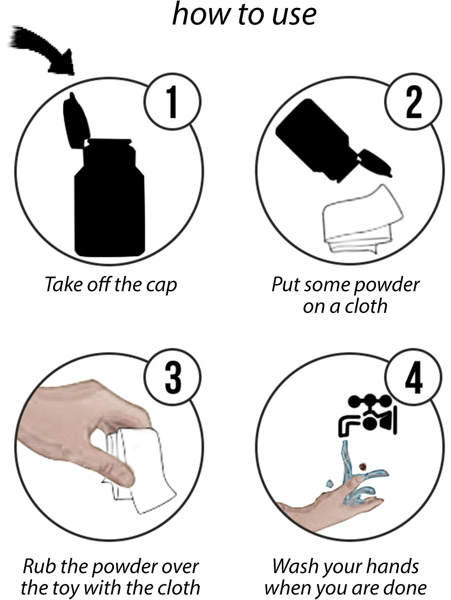 After cleaning, let the toy dry completely before applying the powder. Open the lid of the jar and sprinkle a small amount of the powder on your toy and massage it in with a cloth, clean make-up brush or similar. For example, with dolls and other masturbation-products for men, don't forget to apply the powder to the inside of your toy.