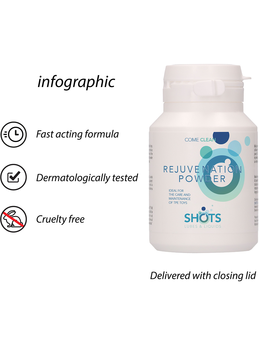 Rejuvenation Powder is a powder designed to care for, and maintain, all your sextoys and sexdolls in TPE-material. By using this powder you extend the life of all your precious toys. The powder helps restore the original structure and prevent the material from drying out.