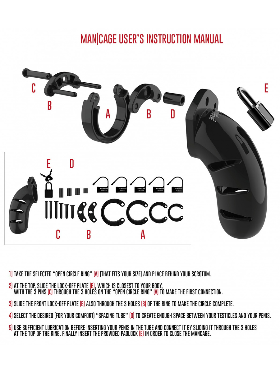 The cage consists of three parts that fit perfectly together. The basering is connected with a pair of pins which are then connected to the cage itself. Your ManCage also comes with rings in different sizes and other important parts that allow you to create an optimal fit for your penis.