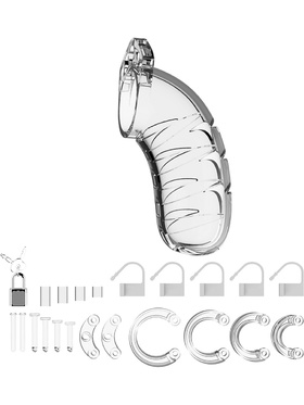 The cage consists of three parts that fit perfectly together. The base ring is connected with a pair of pins which are then connected to the cage itself. Your ManCage also comes with rings in different sizes and other important parts that allow you to create an optimal fit for your penis.