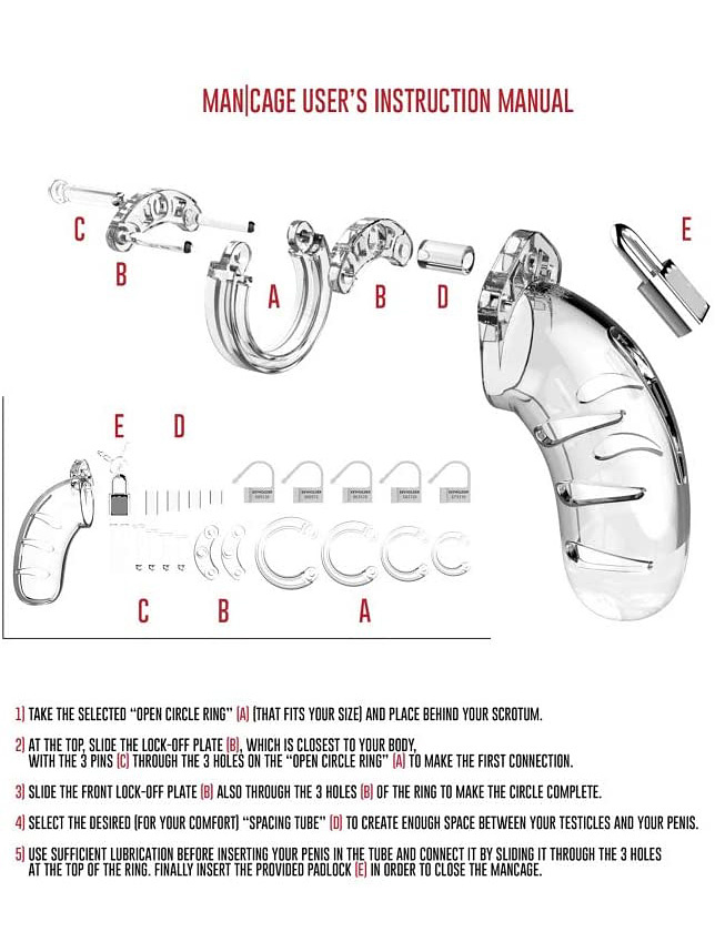 The cage consists of three parts that fit perfectly together. The base ring is connected with a pair of pins which are then connected to the cage itself. Your ManCage also comes with rings in different sizes and other important parts that allow you to create an optimal fit for your penis.