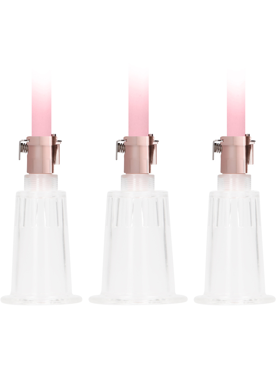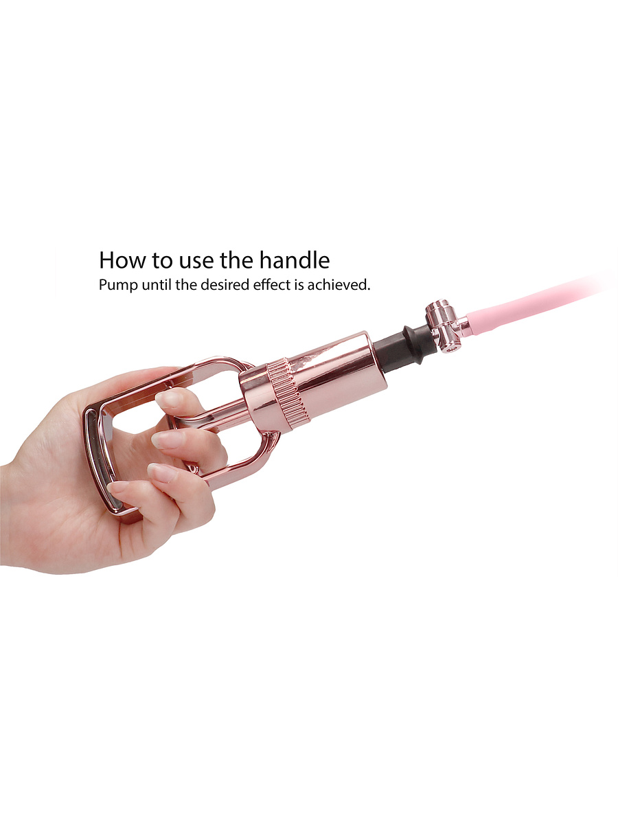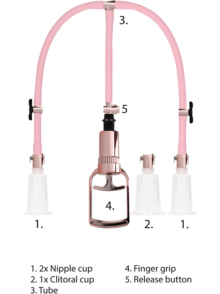 This kit includes three cylinders (one for the clitoris and two for the nipples), a hose and a hand-pump. The product has a stylish design that combines light pink with a delicious rosegold colour.
