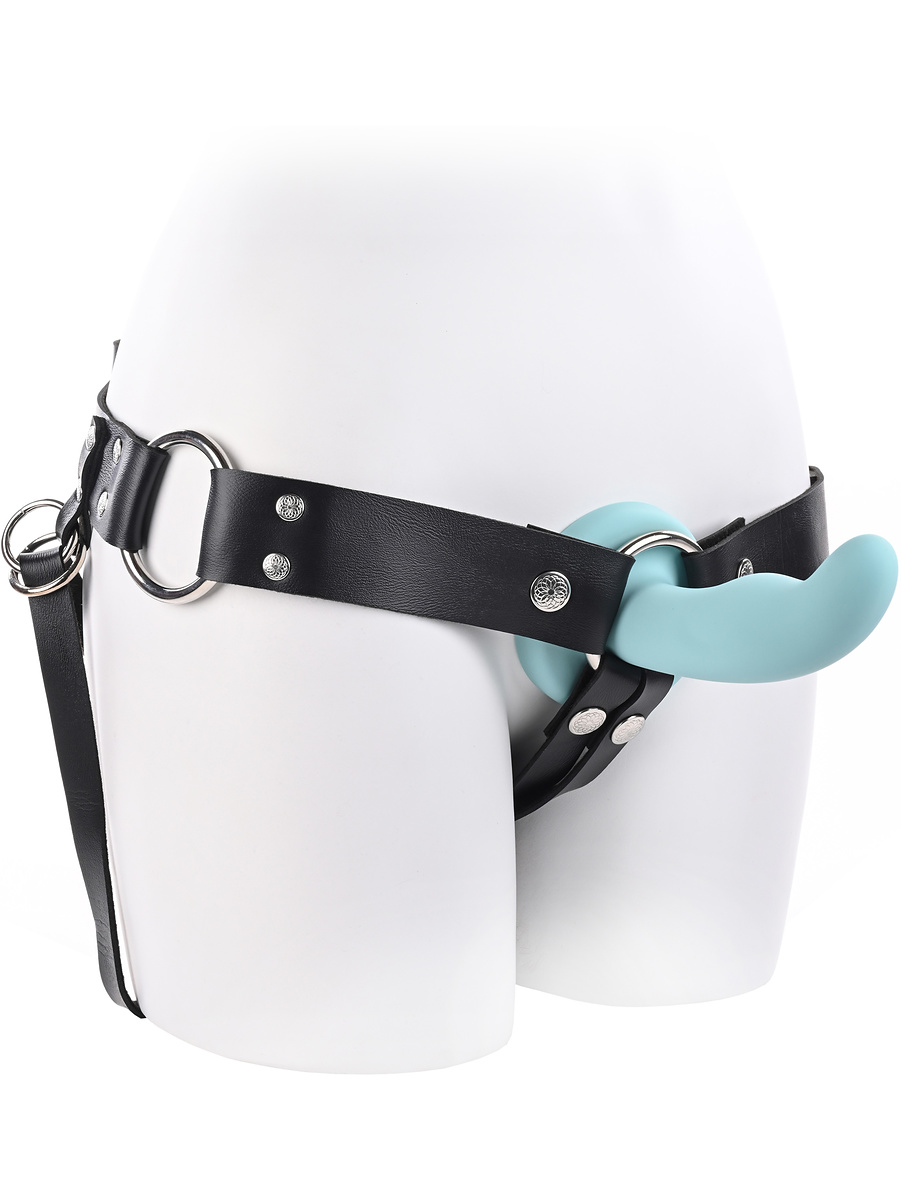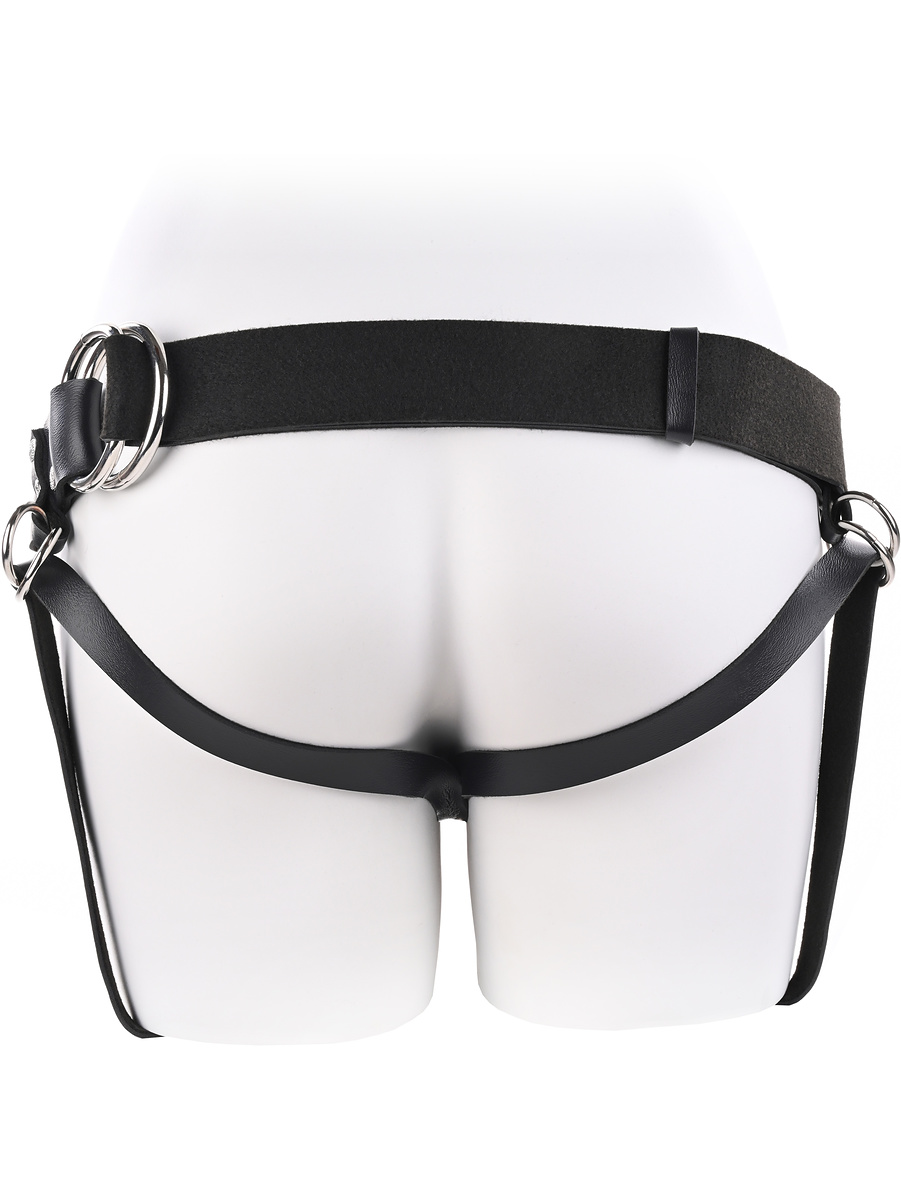 Place a dildo in the O-ring (2 inches), then step into the harness one leg at a time. Pull the harness up around the waist and adjust the waist strap and the straps that go around the legs. Apply water-based lubricant to the dildo and let your partner enjoy pleasant penetration-play.