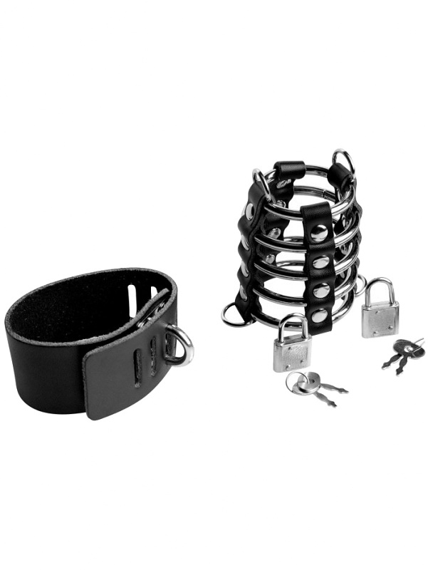 Two adjustable straps are included and can be attached to the cage's D-rings. Fasten one band around both the penis and the scrotum and the other only around the scrotum, which makes it work as a scrotal stretcher and provides extra pressure. You can also lock them with the included locks to prevent you or your partner from removing the cage without permission.