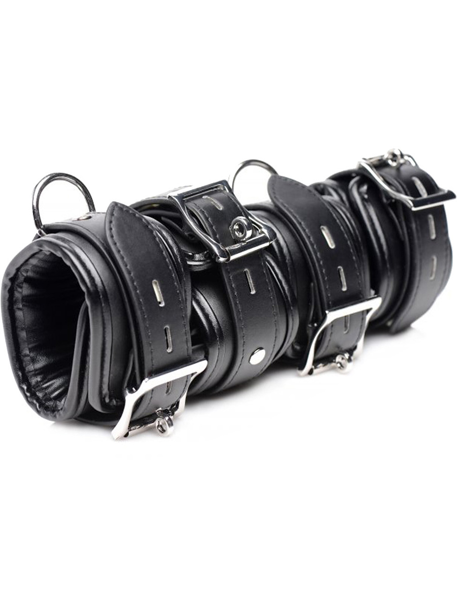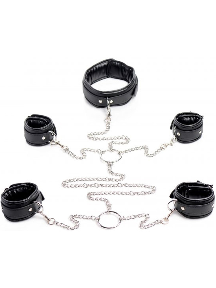 The necklace and the four shackles have a leather-like design in PU-leather with padding for maximum comfort. With stylish buckles, you can easily adjust the size for a perfect fit. On the buckles there is a loop where it is possible to place padlocks (not included) to make the feeling of control even more clear when there is no longer any hope of escaping.