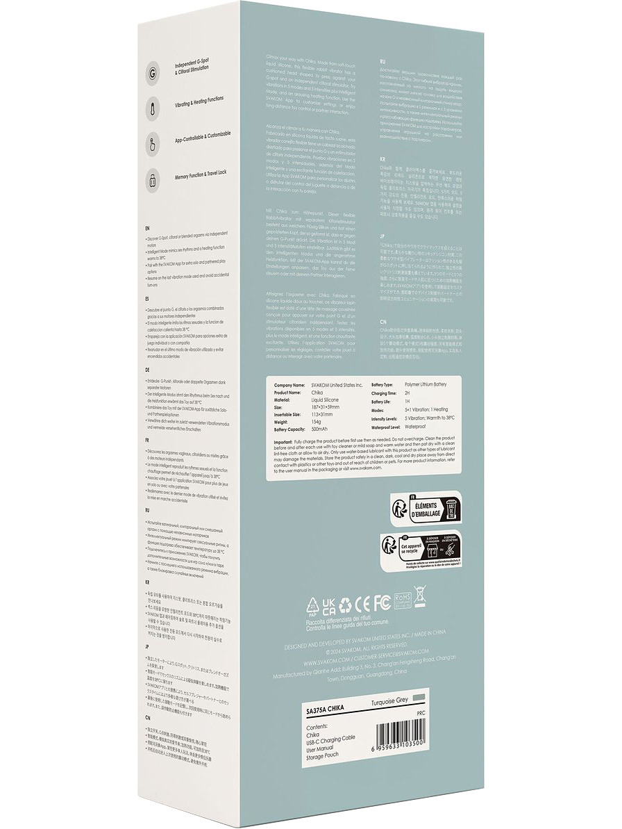 Preset vibration-modes and intensity-levels encourage pleasure from the inside out, while the heating-function increases comfort, relaxation and sexual arousal. To access more vibration-modes and other exciting features, use Chika together with the Svakom-app.