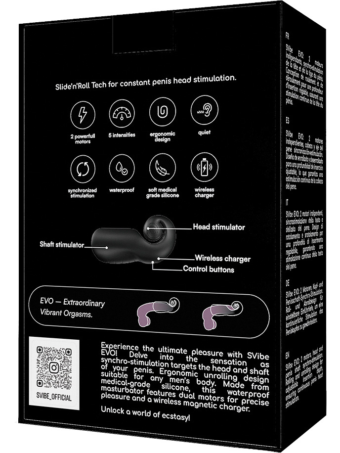 Evo by SVibe is a revolutionary masturbator, designed to stimulate the glans and shaft at the same time so you can experience synchronized pleasure. In each part (the glans stimulation section and the surface for the shaft) there is a motor that delivers intense vibrations. Start the vibrations and customize your pleasure by choosing the perfect intensity-level. Don't forget water-based lube before diving into a great solo-adventure!