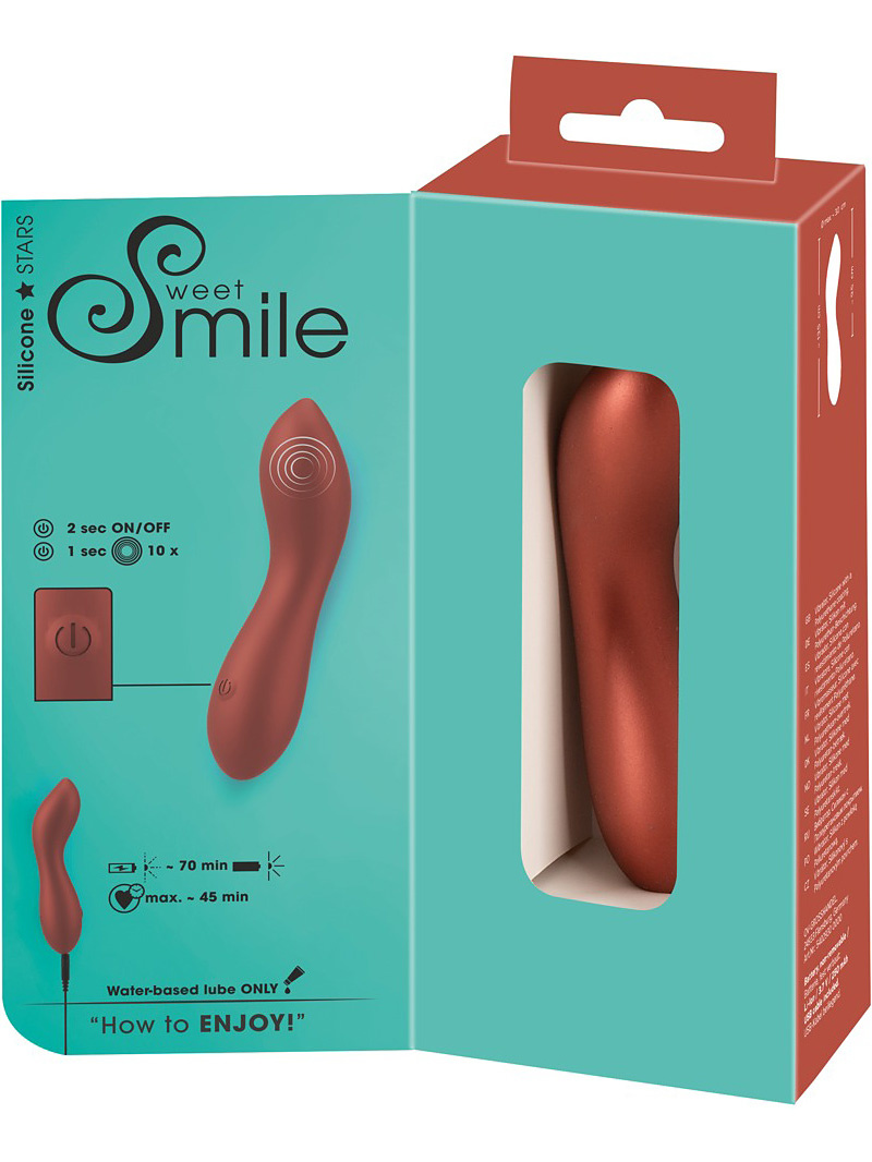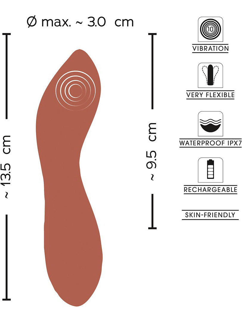 The vibrator has a curved and highly flexible tip that easily reaches the G-spot for precise stimulation. It can also be used to stimulate erogenous zones – alone or with your partner.