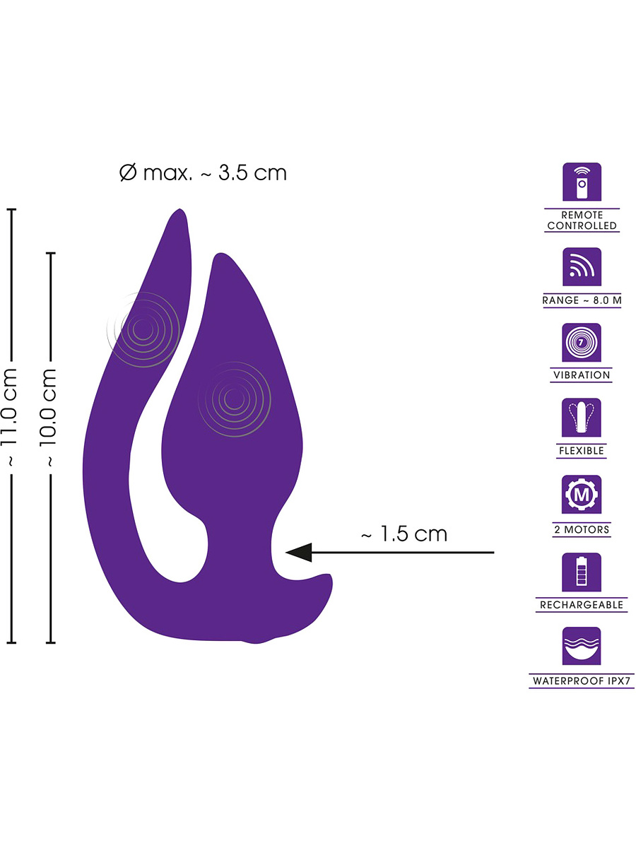 The flexible plug can be used both vaginally and anally and has a flexible shape that follows the body's movements. The outer part is placed against the clitoris or perineum and provides powerful stimulation in harmony with the inner part. The two silent motors work in sync to create a full sensation.