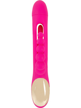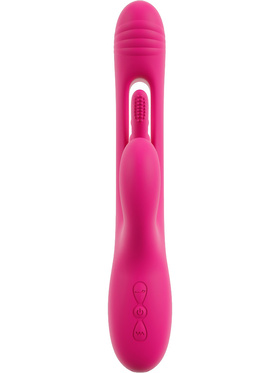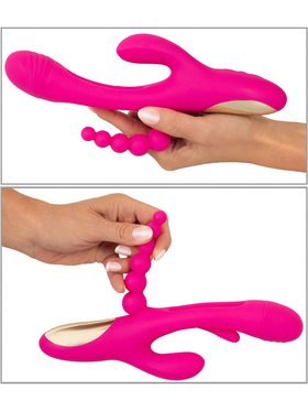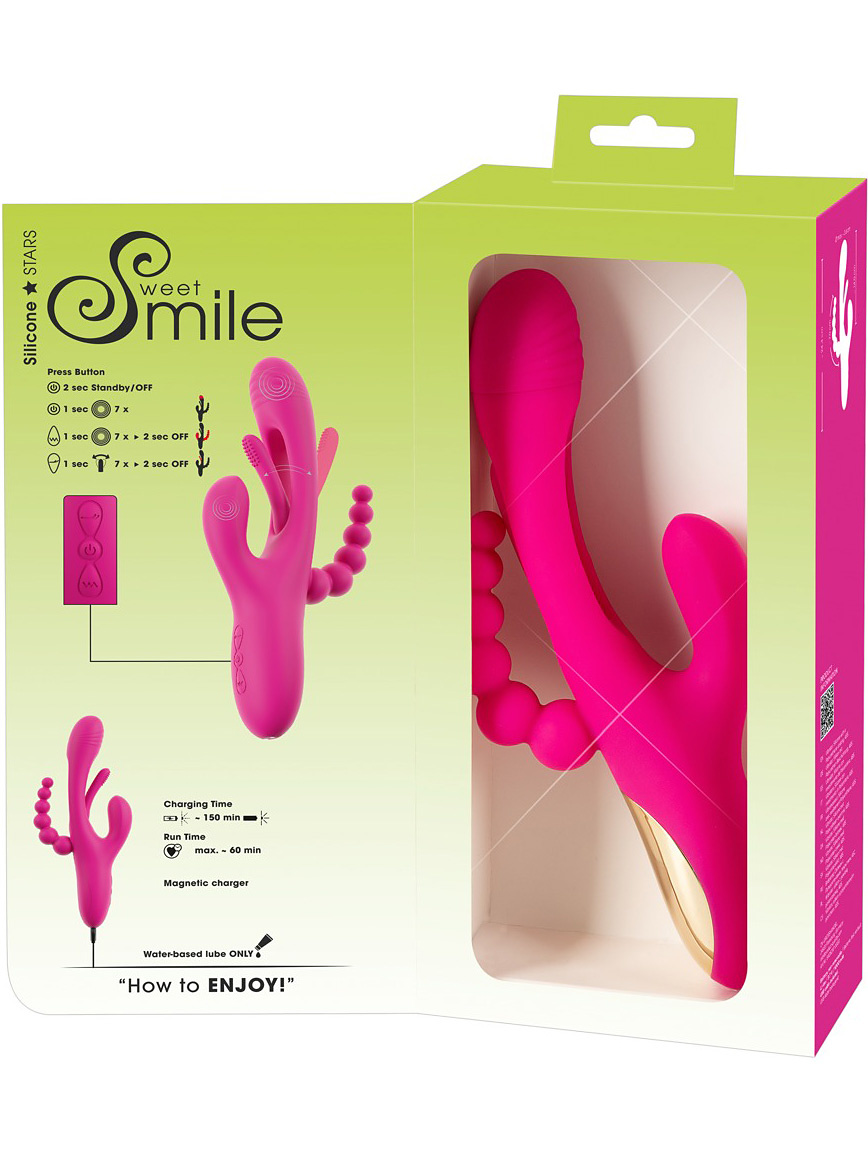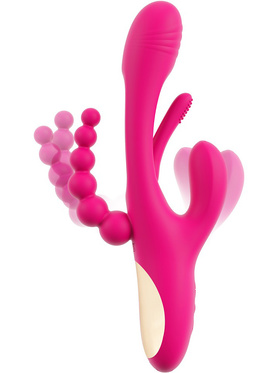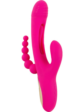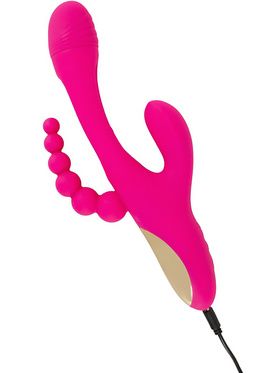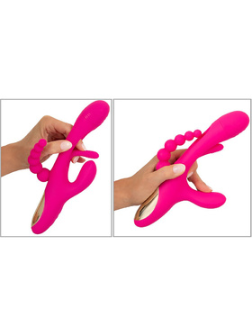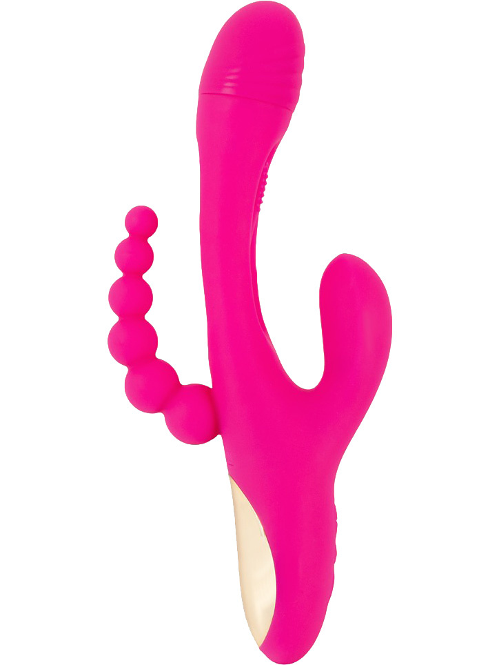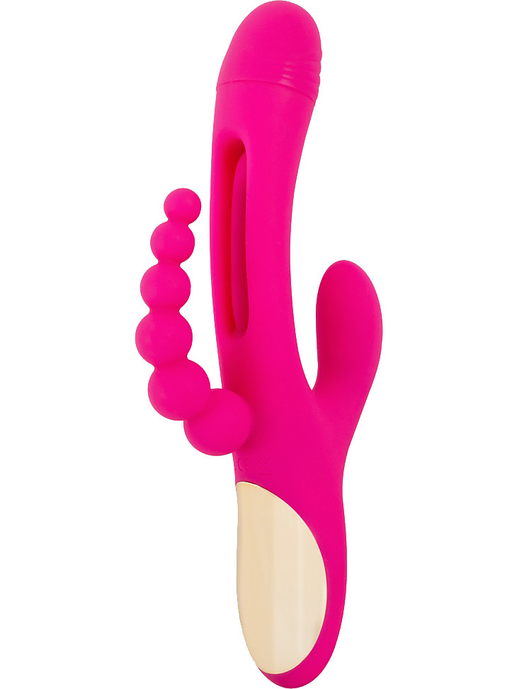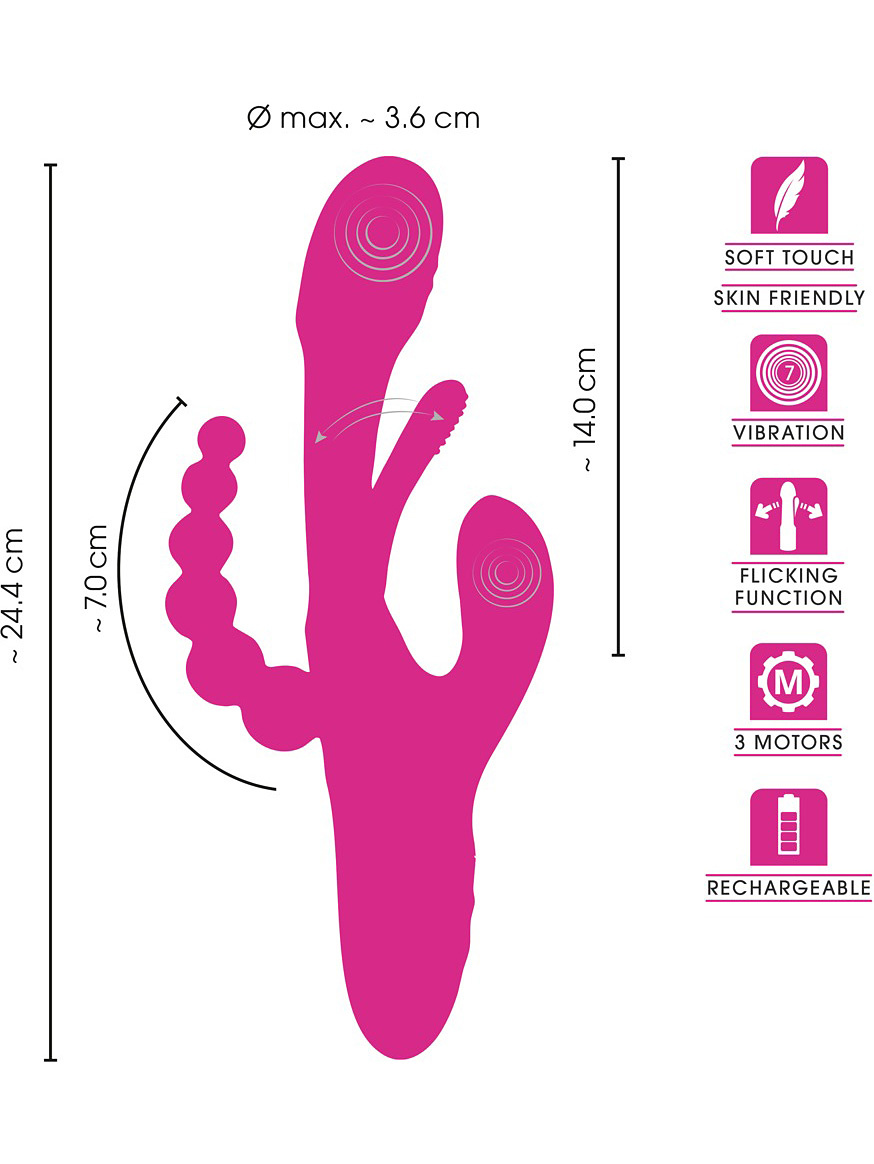 This is an exciting rabbit vibrator that delivers triple pleasure – it stimulates your vagina, clitoris and anus at the same time. The soft and knobby tongue in the shaft moves back and forth for a throbbing stimulation vaginally. The vibrations at the top of the shaft and the two other stimulators provide additional stimulation. This 3-armed vibrator can be used hands-free once fully inserted – just sit back and enjoy!