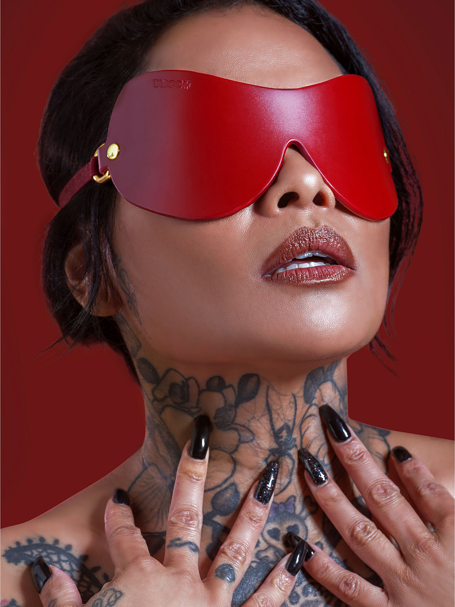 Avant-garde blindfold is designed to allow the wearer to experience total darkness. It is made of vegan-friendly PU leather with nickel-free metal details. The band that goes around the head is elastic for a perfect fit.