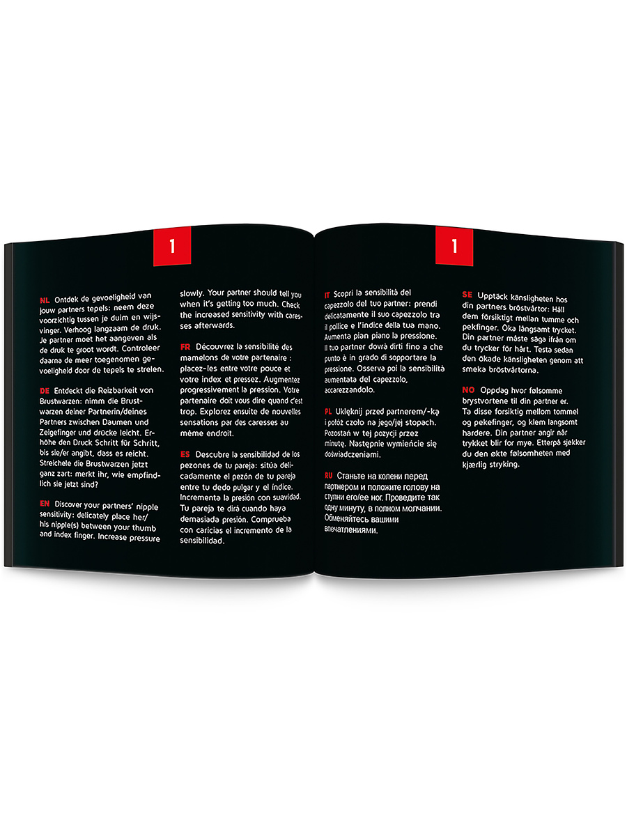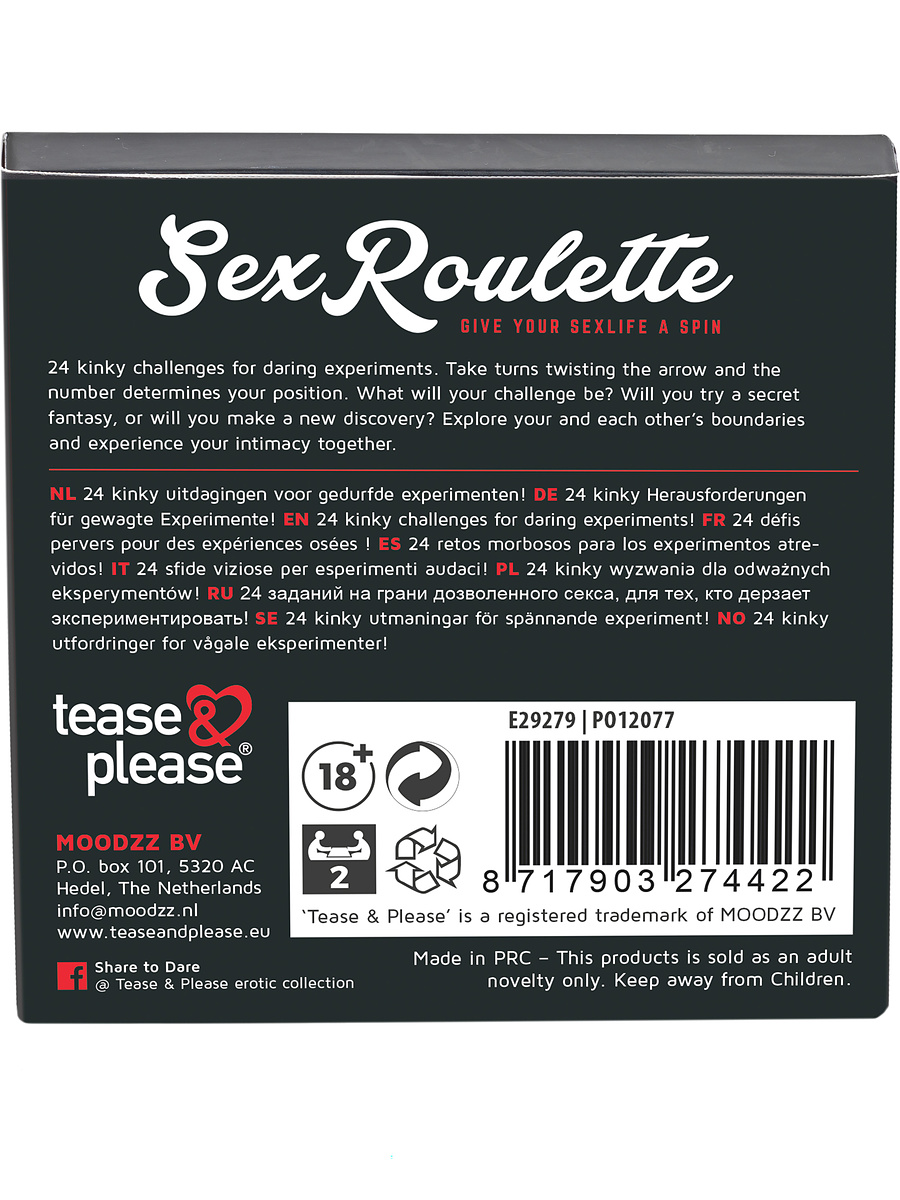 Spin the arrow and let chance decide which challenge you should take on. Each number corresponds to a kinky-themed challenge, created to give thrilling pleasure and extra intensity. The 24 challenges are included in a booklet available in English and 9 other languages: Swedish, Norwegian, Spanish, French, German, Dutch, Polish, and Italian.