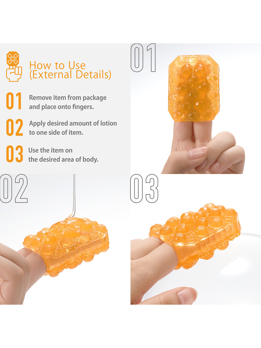 As a finger-sleeve: Take your UNI out of the packaging and place it over two fingers. Apply the desired amount of water-based lubricant and stimulate the desired body area.