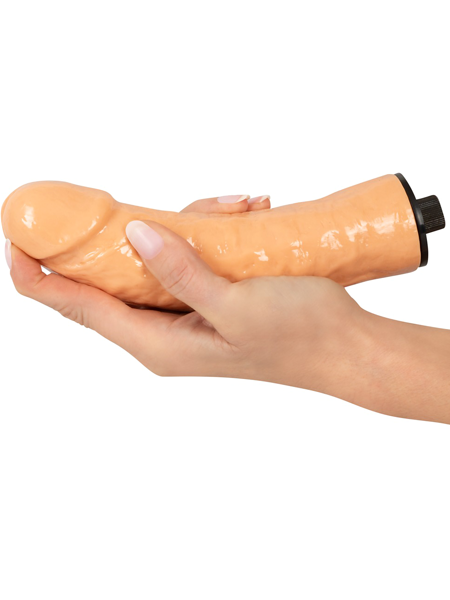 The dildo is made of skin-like TPE-material that makes it feel like a real penis. It is pleasantly firm yet flexible with pulsating veins and marked glans. 18 cm long and a maximum diameter of 4.8 cm.