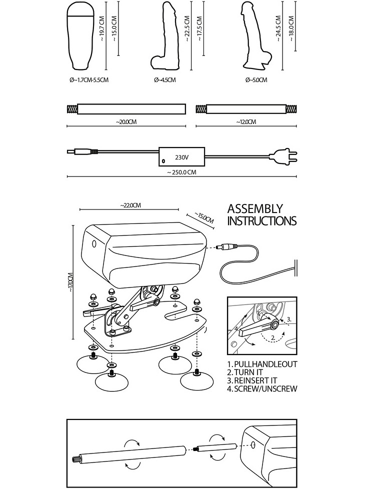 The light and powerful sex machine has suction cups that attach securely to smooth surfaces. The angle can be easily adjusted to fit any position without having to use your hands.