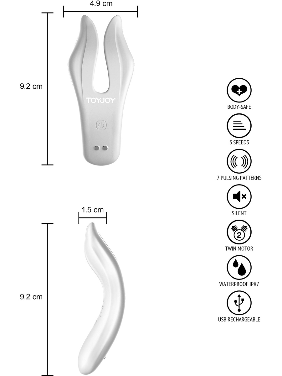 Via the button on the toy, you can choose between 10 different vibration-modes (3 speeds and 7 pulsating patterns) for a wonderful variety. When the battery-level is low, you simply charge it via the magnetic USB-cable. 90 minutes of charging gives up to 90 minutes of pleasure.