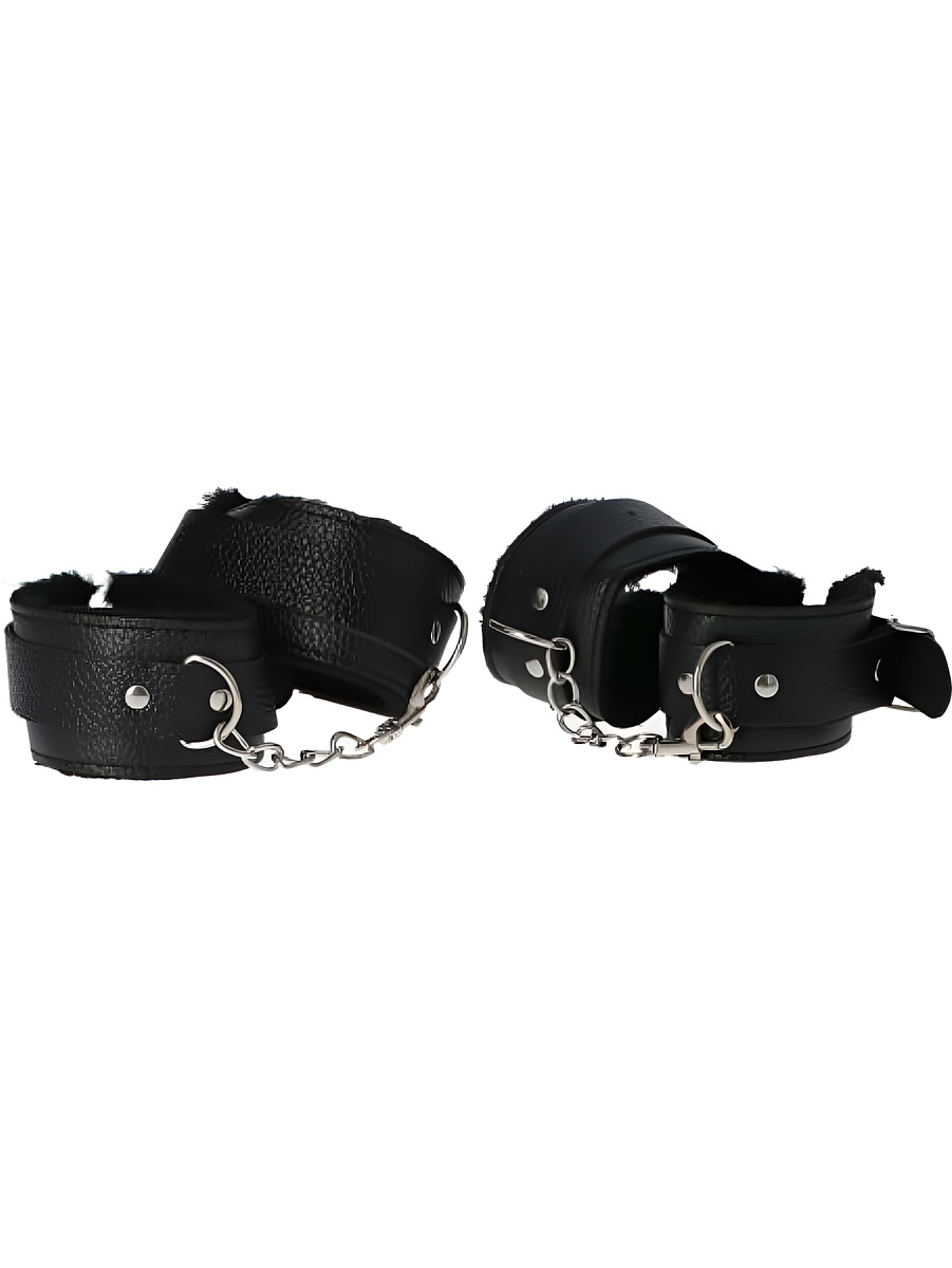 The hand and foot shackles and collar are lined with a soft faux fur for a luxurious look and comfort. The size can be adjusted using the metal buckles. You can also connect the handcuffs and footcuffs via a hogtie, which means that the arms and legs are held in a firm grip, either in front of or behind the back. The synthetic leather leash can be attached to the necklace using a carabiner and D-ring.