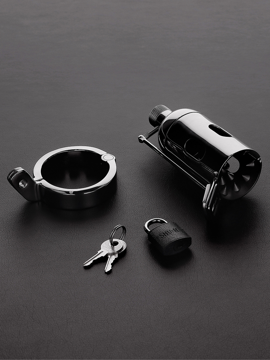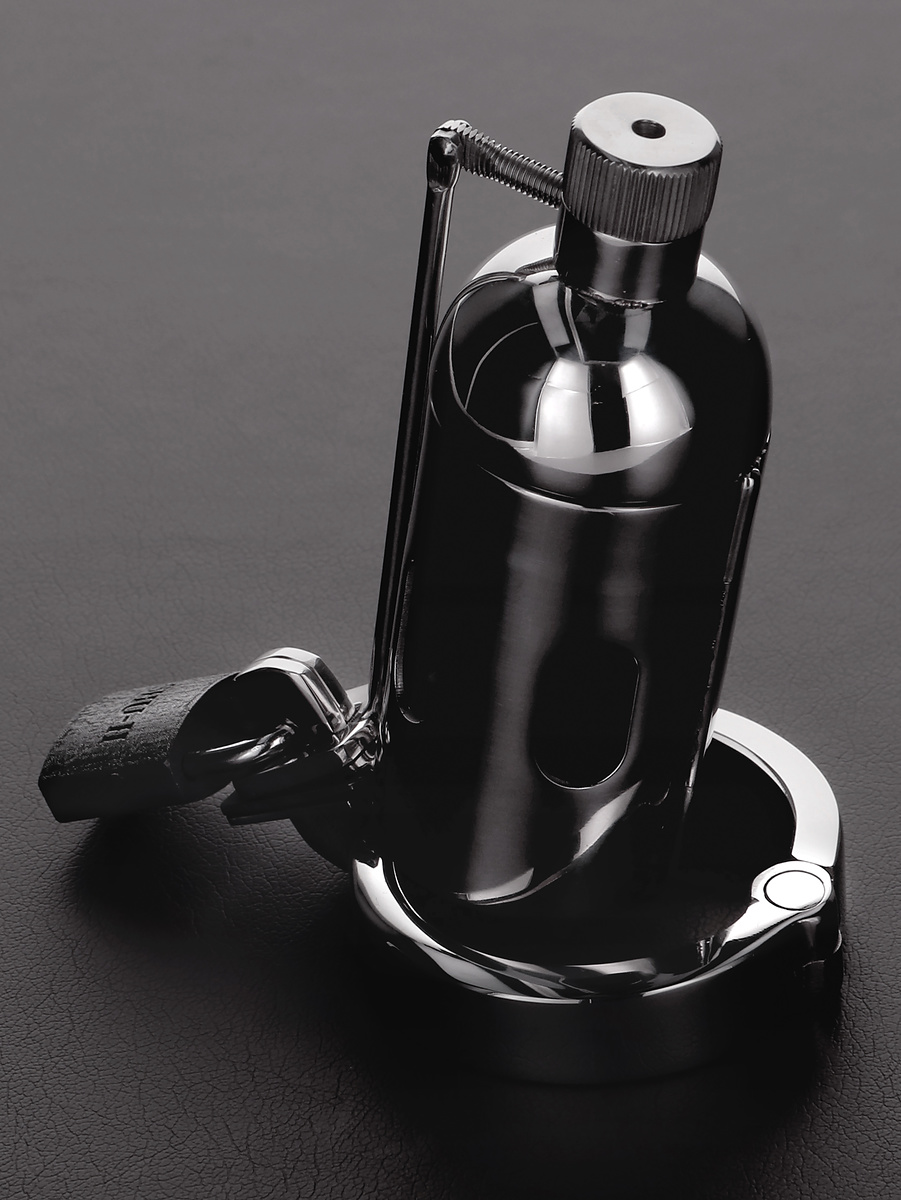 The base ring (4,5 cm) is locked with the supplied padlock (two keys included). Even the penis plug can be locked so you need a key to remove it.